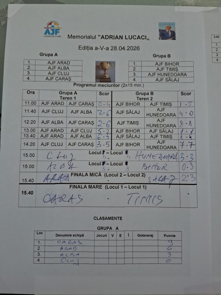 Ieri 28.04.2026, Asociația Județeană de Fotbal Arad a organizat Memorialul „Adi Lucaci”, eveniment dedicat memoriei unui om de fotbal care a marcat profund comunitatea noastră.